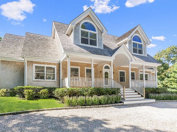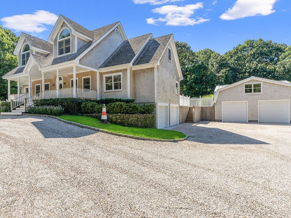 Immaculate traditional on a full grassy acre with a huge detached four car garage offered fully furnished by Restoration Hardware. This lovely home has a spacious eat in kitchen, dining area, white and bright living space with a stone fireplace, ensuite primary bedroom, laundry room and powder room on the first floor. The second story has three guest bedrooms, a full bath and additional space yet to be finished. A large unfinished basement with high ceilings and walk out access to the driveway is just waiting to be transformed. In addition, there is a detached garage with room for 4 cars on the main level with finished space above currently used as an office and gym. A large deck and patio open onto an expansive lawn surrounding the heated salt water pool. Walk down the block to the bay - this location could not be better. All the furnishings included so just move right in and enjoy summer 2022 in the Hamptons.
