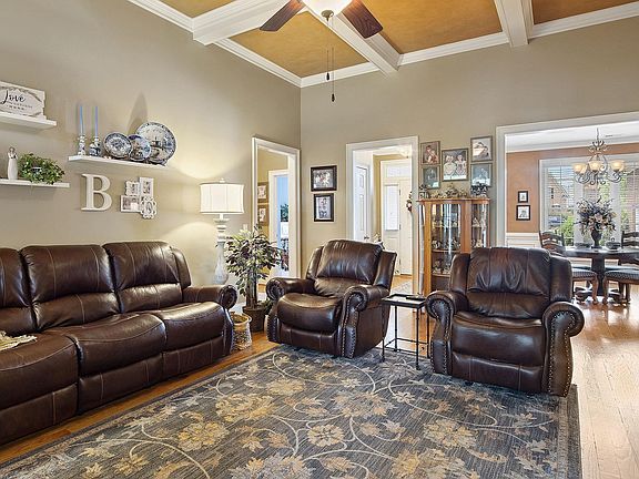 • Living Room: Fireplace, Floors-Hardwood, French Doors, Molding, Ceilings-Box, Beams, Ceilings-High (over 9 Ft), Ceiling Fan