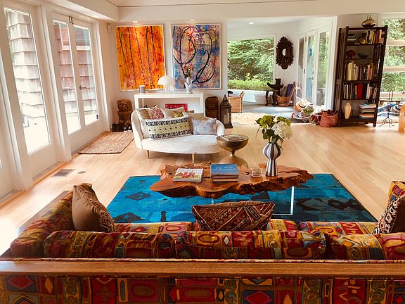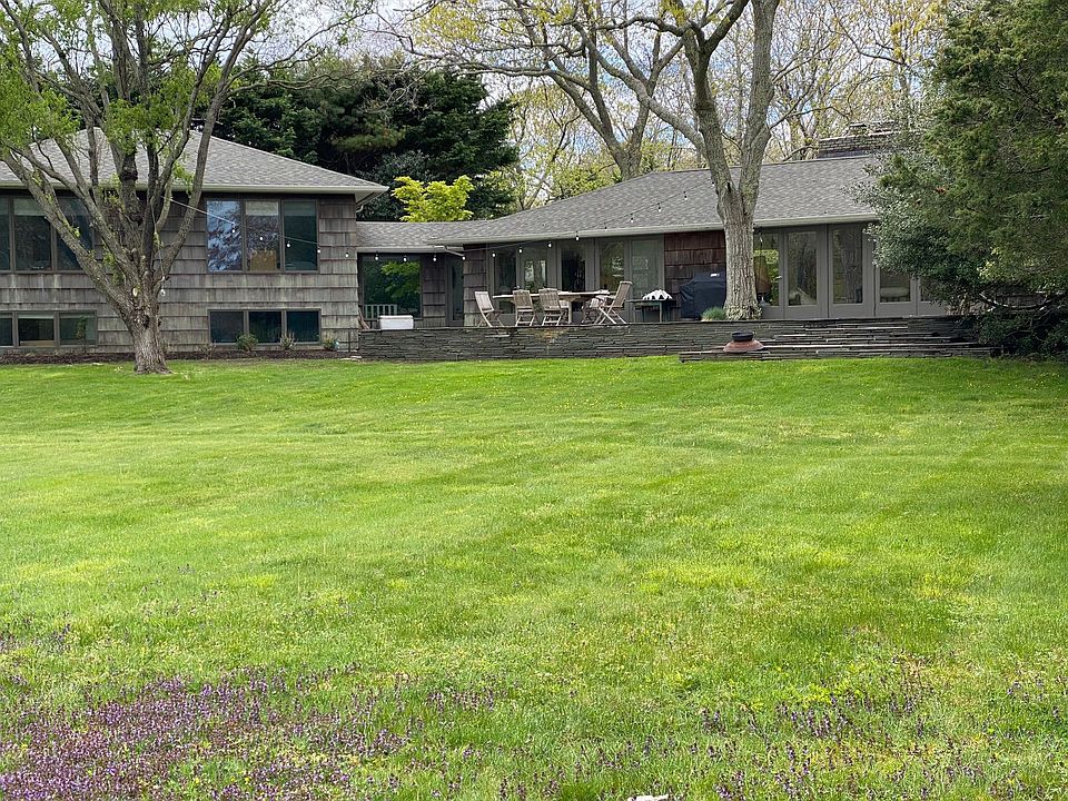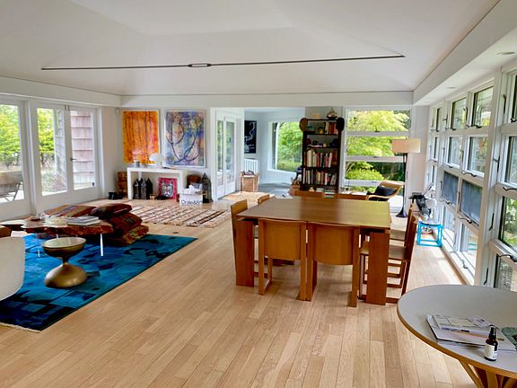 This classic midcentury modern home is just a short walk to a beautiful bay beach on Gardener's Bay. Located on over an acre,it offers light-filled, loft-like open living areas. The 2,700 sq. ft. of living space includes four bedrooms, master bedroom with en-suite bath in one wing, three additional bedrooms, plus a den/playroom and two baths in the multi-level guest area. A stone-floored, glass-enclosed entry opens to both the front and rear lawns, which are spacious and verdant, with shade trees and gardens. The living and dining area features a vaulted ceiling, a wall of windows overlooking the pool and grounds, wood-burning fireplace set in a brick wall shared with the kitchen. The kitchen is equipped with stainless steel appliances, a quartz cooktop, double sink and workspace.