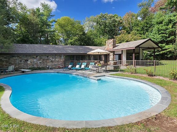 Sited on two private acres overlooking a beautiful pond, this four-bedroom home delivers Mid-Century architecture with a natural stone and stucco exterior, vaulted ceilings and walls of glass. The recently updated eat-in kitchen with white cabinetry, stainless steel appliances and a small sitting area is a delightful light-filled space perfect for cooking and gathering. Great flow indoors and out is ideal for entertaining or enjoying the pool. The master bedroom suite anchors the corner of the home providing privacy, newly renovated bath, walk-in closets and access to the outdoors. Recently upgraded mechanicals, roof and asphalt driveway. Located south of the Merritt Parkway just minutes to town, Metro North Train and I-95.