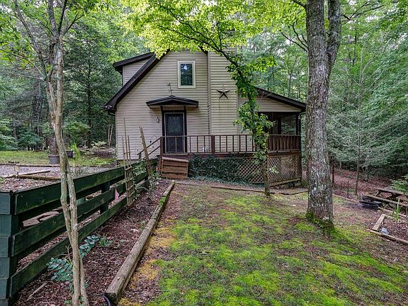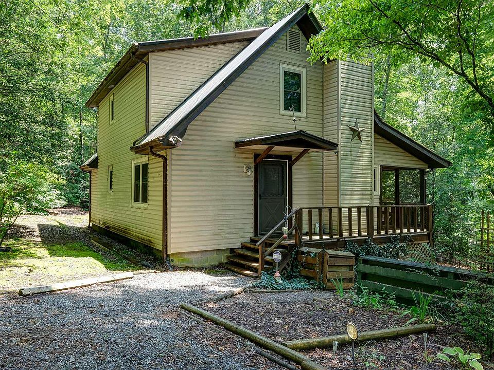 Charming 3 bed two bath private chalet nestled into the peaceful woods in privacy. This home has newly replaced vinyl siding & also has brand new windows and doors. Outside, there is level rolling land with plenty of room to garden or to play with young ones making memories! You will instantly fall in love with the vaulted ceiling! Enjoy the classic rustic kitchen for all chef's or chef's in the making needs! Downstairs there is one bedroom that has plenty of space and a large closet. Upstairs there is two more bedrooms & another bathroom. On the wrap around porch you can relax or throw fun family get together's. This home has endless opportunities! Make the jump and enjoy these mountains!!