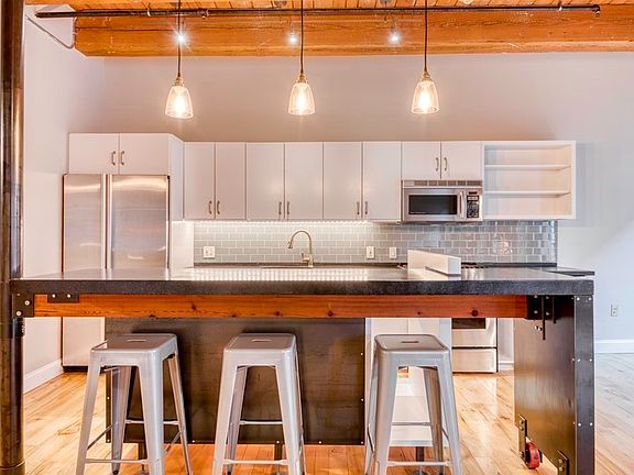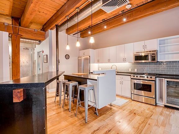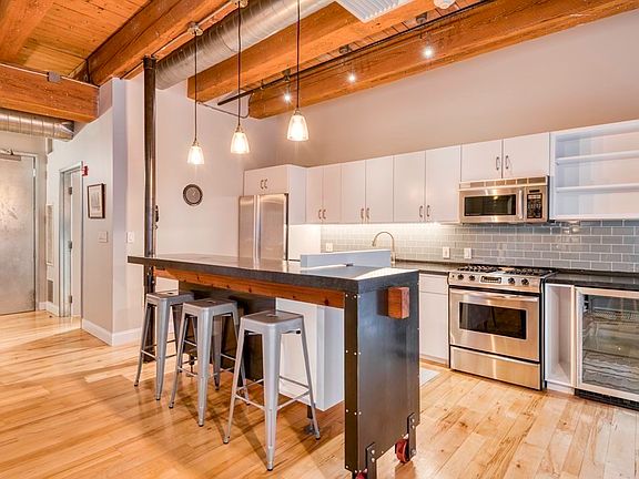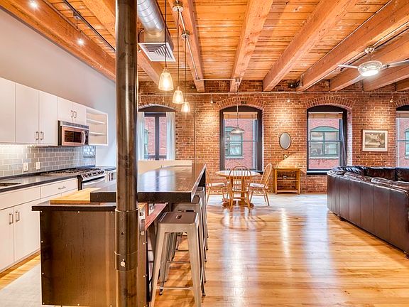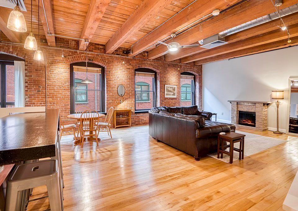 OPEN HOUSE CANCELLED. AN OFFER TO PURCHASE HAS BEEN ACCEPTED. Chic metropolitan brick & beam LOFT residence with attached deeded heated garage parking available at Fort Point Place in Boston's Seaport District neighborhood. Just some of the accoutrements include; a beautifully designed custom kitchen featuring a rolling concrete kitchen island / buffet table, modern tiled backsplash, stainless steel appliances and wine fridge. Gorgeous wide plank maple hardwood floors, 11 foot high ceiling, exposed brick & beams, high-end low voltage track lighting system in the main space, bespoke rolling translucent doors, a large walk in storage closet and several creatively designed storage areas, 3 large industrial windows and a Juliette balcony offering superb natural light. Gas cooking, central air conditioning, electric mantel fireplace, ceiling fan, Samsung large capacity clothes washer & dryer. Under a 10 min walk to South Station and Seaport Blvd. THE MONTHLY CONDO FEE IS $351.