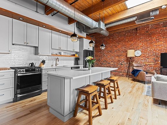 Fort Point Place is a gorgeous loft elevator building converted to condos in 2000 & nestled in the vibrant Fort Point Channel Landmark District, close to excellent restaurants & coffee shops. Enter this beautiful completely renovated top-floor unit through a lovely front foyer, then walk into the living room/kitchen/dining room, complete with expansive open concept space, soaring ceilings, rich maple floors & large windows that allow in an abundance of light all day. The main room boasts an entire wall of exposed brick & oversized wooden beams running across the ceiling. The brand-new kitchen features an island perfect for bar stools & casual eating, stainless steel appliances, gas cooking, & ample storage space. The luxurious bathroom is recently renovated with abundant storage & large glass-enclosed tiled shower. The spacious bedroom easily accommodates a king-sized bed and is adjacent to a massive walk-in closet: one tandem garage space, stacked washer, and dryer.