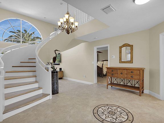 Serene waterfront retreatElegant tiled entryLarge tiled deckSweeping staircaseSoaring ceilingsExpansive first-floor primary suiteWhirlpool soaking tub