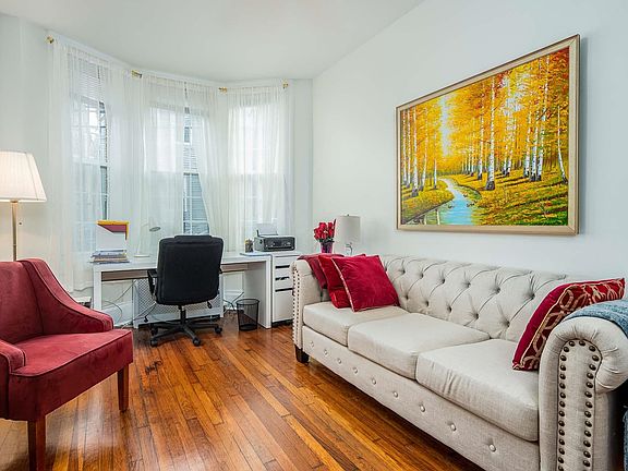 Experience modern living in this beautifully renovated one-bedroom rental, perfectly situated for those seeking convenience and style. Boasting 600 square feet of thoughtfully designed living space, this unit features soaring 9-foot ceilings that create an open, airy feel, complemented by the recently refinished hardwood floors that run throughout. Enjoy the newly renovated bathroom and kitchen, featuring high-quality Whirlpool appliances and artistic subway tiles. The floors are adorned with 1x4 Calacatta marble, complemented by new fans and cabinets. Countertops are Terrazzo Blanco, paired with white subway tile backsplashes from Artistic Tile. Natural light floods the living room through charming bay windows, creating a warm and inviting atmosphere that's perfect for relaxing or entertaining. The tasteful, recent updates ensure a fresh, contemporary vibe while maintaining timeless charm. Located just steps away from NYC transportation, this rental is a commuter's dream, offering unparalleled convenience to the city. As an added bonus, heat and hot water are included, providing stress-free living and added value. Don't miss this incredible opportunity to call this stunning apartment home. Schedule your viewing today!