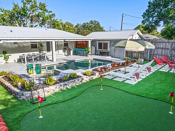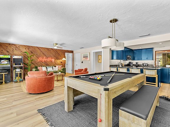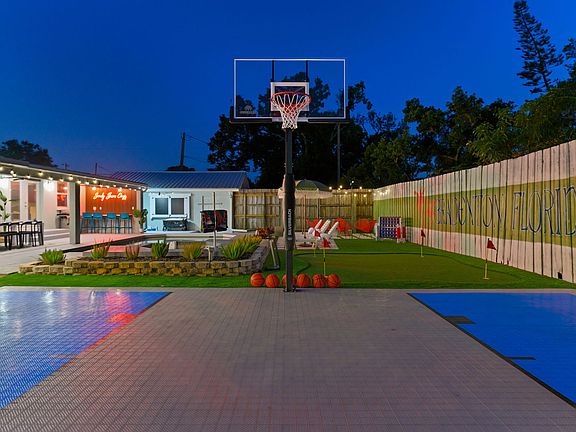 Welcome to your ultimate vacation retreat in Bradenton, Florida! This expansive 6-bedroom home is packed with amenities and offers everything you need for an unforgettable stay. With a heated private pool, basketball court, fire pit, movie theater, game room, outdoor bar, BBQ grill, and more, you'll feel at home in this vibrant space. The fully stocked kitchen and TVs in each bedroom ensure comfort and convenience for all guests. The property is family and dog-friendly, with ample parking and a dedicated workspace. This spacious getaway features six beautifully designed bedrooms and four full bathrooms, comfortably accommodating up to 20 guests. Whether you're here for the nearby beaches or to explore the Gulf Coast charm, this home has everything you need. From cozy bedrooms to entertainment-filled areas and a backyard designed for fun, every corner of this home invites you to unwind and enjoy the best of Bradenton. The chef's kitchen is fully stocked with high-end stainless appliances, a large refrigerator, ample cabinetry, and a large island with high seating, perfect for preparing meals and gathering with loved ones. The heated private pool is available for $125 per night, and we recommend heating it between October and May. Up to two dogs are allowed for $125 per stay, but no cats please. Parking is available in the driveway for up to five cars. If you're interested in a long-term stay, please reach out to inquire about availability. Located in sunny Bradenton, Florida, this home is close to a variety of attractions. Explore the scenic trails at Robinson Nature Preserve, enjoy the Bradenton Riverwalk, or visit the De Soto National Memorial Park. For a cultural experience, head to The Bishop Museum of Science and Nature or the Palma Sola Botanical Park. Dining options abound, with nearby restaurants like Pier 22, Ortygia, and O'Bricks Pub & Martini Bar offering diverse menus. Getting around is easy with car rentals and rideshare services like Uber and Lyft readily available. Check-in is at 4pm and check-out is at 10am. No parties are allowed, and violations may result in immediate termination of the stay. An exterior camera is installed solely to monitor our cleaning team for quality and security purposes. Guests must be 21 years or older to book this property. A guest verification process is required within 48 hours of booking confirmation, and a rental agreement must be signed prior to check-in. A non-refundable $60 damage waiver is required, covering accidental damage during your stay if reported before check-out. The home features a dedicated workspace, perfect for those who need to work remotely during their stay. A laptop computer is not included.