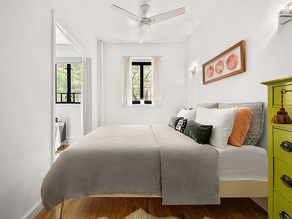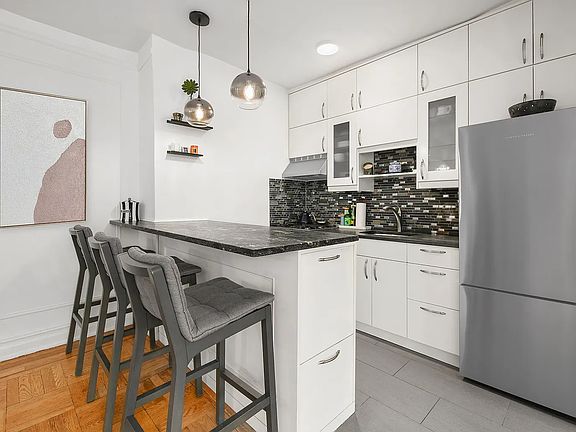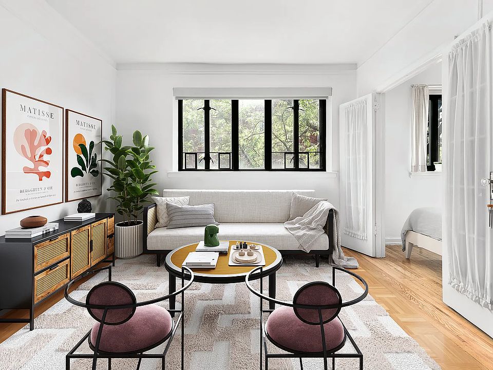 210 Sixth Avenue, 4G is a charming and recently renovated one-bedroom apartment ideally located at the nexus of Soho and the West Village. This luxurious apartment combines the timeless appeal of a pre-war home with modern upgrades for convenience and comfort. Inside, you'll find classic features like a proper entry foyer, soaring 9-foot ceilings, arched doorways, restored picture frame and crown moldings, and beautiful hardwood floors. The apartment also offers ample storage space, including a large dressing room with a custom closet system and a spacious walk-in entryway closet. The sunny open living/dining room is a delightful space highlighted by a wall of casement windows overlooking the peaceful tree-lined MacDougal Street. The well-designed layout easily accommodates both a living room setup and a full dining room table. The chef's kitchen features new high-end appliances, including a Fisher Paykel fridge and a Bertazzoni range. It is enhanced with elegant finishes such as a leathered granite breakfast bar, pendant and recessed lighting, and a custom herringbone backsplash. The bathroom has been gut renovated and now showcases floor-to-ceiling porcelain tiling, dual medicine cabinets, Caesarstone counters, a rainfall shower head, recessed lighting, and custom fixtures. Additional upgrades in apartment 4G include new through-wall air conditioning units, double-paned city windows, Lutron shades, recessed lighting, and high-end custom light fixtures throughout. 210 Sixth Avenue is an intimate 46-unit Art Deco elevator co-operative, built in 1930. The building features an impeccably maintained lobby, a live-in superintendent, and a video intercom system for added security. On-site laundry facilities, bike storage, and additional storage options are available. Pets are welcome, and the building allows pied-a-terres and co-purchasing on a case-by-case basis