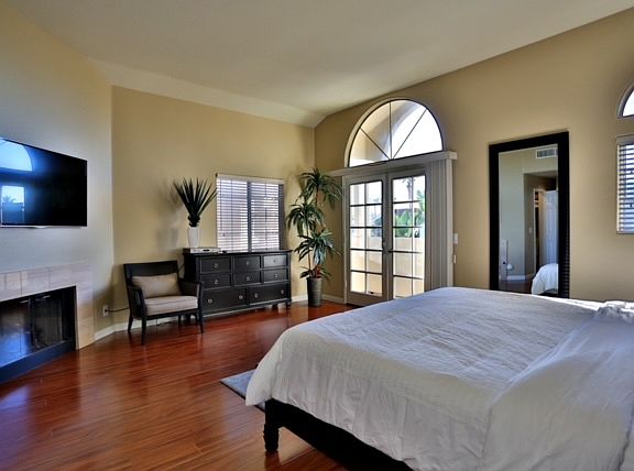 The living room has a large sectional sofa, a fireplace, and a hi-def television. French doors open to a large front patio, outfitted with a gas barbeque and plenty of comfortable seating.