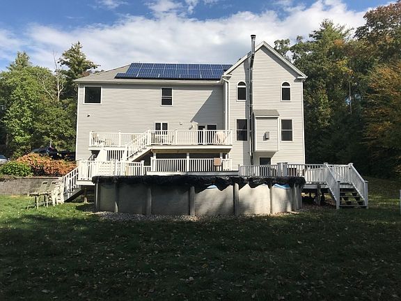 Beautiful Colonial on a private 3.95 acre lot. Stunning two story entry foyer with hardwoods throughout the home. Gorgeous 2-story Living room with stone gas fireplace. First floor featuring a Dining room, tiled full bath and an entertaining/game room area. Remodeled center island kitchen with granite counters and stainless appliances. Spacious 6'X6' walk-in pantry off of kitchen. French doors in kitchen lead to a tri-level composite/vinyl deck surrounding a 27' above ground pool. Second floor features a full tiled bath, tiled laundry room, 4 bedrooms including a oversized master bedroom with large walk-in closet and a full tiled master bath featuring a Jacuzzi tub. In addition to a two car garage with openers property also features a 20x35 garage with electric and loft area. Extra amenities include central vac, hard-wired generator ready, 8-zone sprinkler system, wired ADT security, home security cameras and solar panel system.
