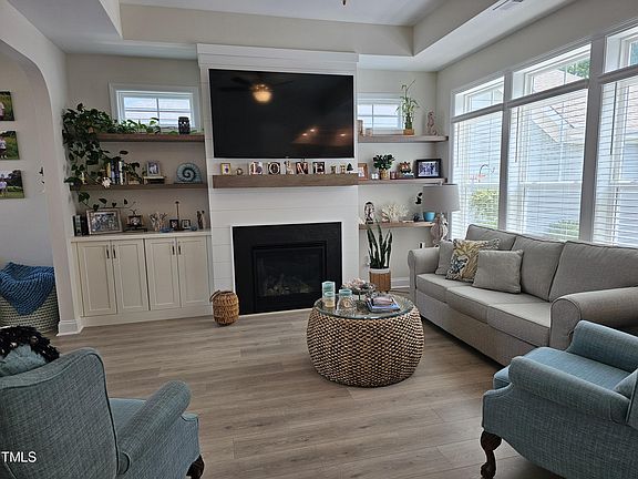Private backyard view of woods for this beautiful Ranch in the Cottages at Evergreen, a 55+ Gated Community in Flowers Plantation! Lawn maintenance included with semi-annual pruning done for you. Easy clean LVP flooring through-out. Well appointed kitchen has Stainless Steel appliances, gas range, granite counters, a center island w/farm sink & bar seating, cabinets with crown molding, a large walk-in pantry, & a dining area opening to the patio. The family room features a gas fireplace with shiplap wall. A home office/den with two walls of windows open to the front of the house is located off the living room. You could add a wall or glass doors to make it a private music room or studio. The owners suite includes a trey ceiling, en-suite bath with zero-entry tiled walk-in shower, a walk-in closet, sliding door to the screened porch w/Plantation Shutters floor to top of door, and a double vanity. The generously sized Guest bedroom is across from the hall bath. The very spacious Laundry room has options for hanging racks and more shelves. The cabinets above the W/D provide ample storage. Access to the pull-down attic stairs is easy to reach. Enjoy the patio and screened porch overlooking a lovely wooded area with Crepe Myrtles. Located close to the East Triangle YMCA in Flowers Plantation, Harris Teeter, Publix Supermarket, dining and other available.shopping. Coming in 2025 The Waterfront District! with even more shopping. Golf Cart accessibility to most shopping areas and the Flowers Plantation neighborhoods right across the road.