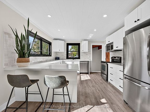 Welcome to 210 Brock Street, Stayner a charming family home tucked into one of Stayner's established neighbourhoods. This well-maintained 3-bedroom, 2-bathroom property sits on a generous in-town lot with mature trees, offering plenty of outdoor space for kids, pets, or entertaining. Step inside to a bright, inviting layout filled with natural light from large windows. The main floor boasts a spacious living room with a cozy fireplace and built-in storage, along with an updated kitchen featuring quartz countertops and stainless steel appliances. The primary suite includes a walk-in closet and a private ensuite for your convenience. Outdoors, enjoy your morning coffee or summer barbecues in the private backyard retreat. The quiet, family-friendly location is just steps from schools, parks, and downtown amenities, while only a short drive to Wasaga Beach, Collingwood, and Blue Mountain. Whether you're starting out, raising a family, or seeking a relaxed lifestyle close to it all, 210 Brock Street is the perfect place to call home.