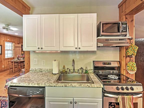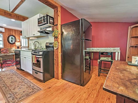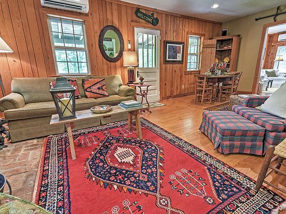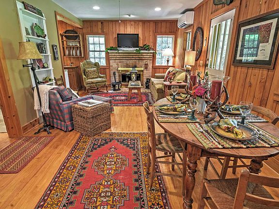 This In-town, adorable cabin sits on 2.6 acres with a stream and pond. It features hardwood floors, 2 fireplaces, metal roof, firepit, decks and a beautiful yard. Great, successful rental history.