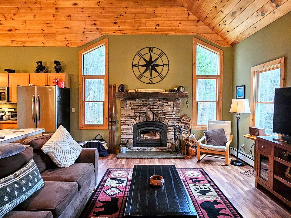 Impeccably maintained 2007 residence in like-new condition, offering quality construction and thoughtful design throughout. The home features vinyl siding and a full concrete walk-out basement with high ceilings—an outstanding opportunity for adding 1000+ future finished living space customized to your needs. The main level showcases an open-concept living, kitchen, and dining area with natural wood flooring, dramatic vaulted ceilings, and a stone-faced fireplace as the centerpiece. The kitchen is well appointed, stainless appliances, a large center island for gathering and prep, ample cabinetry, and a generous pantry cabinet for exceptional storage.Two bedrooms and a full bath complete the main floor. The second level is dedicated to an expansive primary suite consisting of open loft, enclosed bedroom area, full bath, and flexible bonus room well-suited for an office, studio, or quiet retreat.Outdoor living spaces include a covered front porch and a private covered rear porch overlooking the fenced backyard—ideal for privacy, pets, protected play. The property features a mix of open lawn and gentle woodland with direct VAST trail access from the far end of the land. Wired for a whole-house generator for peace of mind. Walk-out lower level includes laundry and excellent space for a workshop and storage as is or finish off and add 1000+ more sq feet to suit. A beautifully maintained, turnkey home in a desirable recreational setting with strong potential for future expansion.