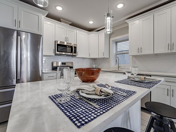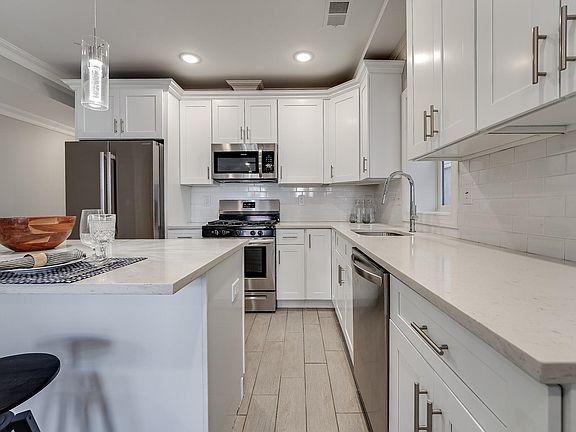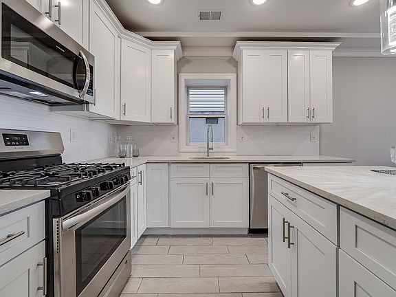 Garden level brings grandeur in this luxurious and newly refinished parisian-style home. Step inside to the three bedroom and two bath home plus beautiful backyard in Jersey City Heights. Stunning Haussmann architecture exterior shines with stone walls, square roof, wrought iron Juliet balconies and dormer windows. Classic elegance stretches throughout with gleaming hardwood floors, crown molding, ceiling fans and oversized windows. Open floorplan living offers access to the private backyard directly from the living area, ideal for extended outdoor living and entertainment. Eat-in kitchen offers oversized island with pendant lighting, quartz counters, cherry custom cabinets, tile backsplash and stainless appliances. Spacious bedrooms bring plenty of natural light with primary ensuite offering extra large walk-in closet. Bathrooms offer both bathtub and shower with sizable vanity and medicine cabinet mirror for additional storage. One block from both Washington Park and Central Avenue, this home is situated for ideal access to both urban and outdoor living. Jersey City Heights is the fastest growing part of this eclectic community, offering boutique shops and restaurants, expansive parks, excellent schools and easy access to NYC and surrounding neighborhoods.