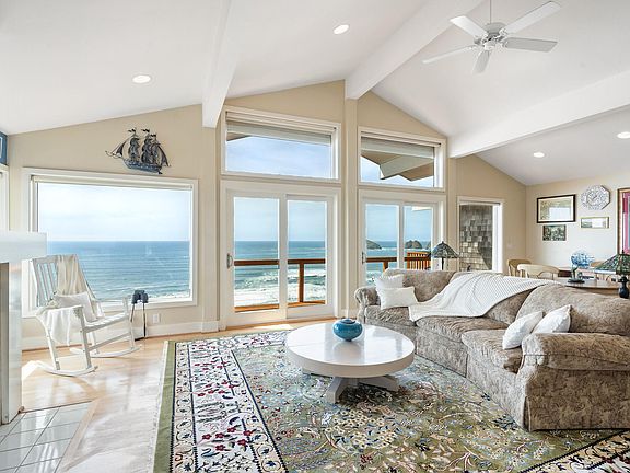 OCEANFRONT ELEGANCE with stunning and panoramic ocean view from 3 Arch Rocks to Cape Lookout. Beautiful interiors, newer decks and roof. Oceanfront decks on 3 levels. Grand entry leads up to spacious greatroom with open kitchen, large fireplace with built-ins, vaulted ceilings, hardwood floor. Master suite boasts large bath with oceanview jetted tub, walk-in closet, double vanity, separate shower. Bonus storage room on bottom floor. Long driveway & large front yard, fenced courtyard. New carpet just installed.