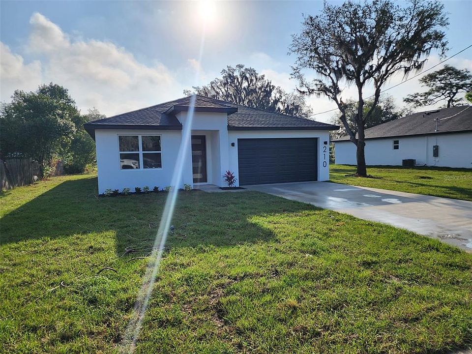 This beautiful brand New Construction home sits on a sprawling lot of almost an acre, providing ample space for outdoor activities, gardening, and entertaining. As you step inside the home, you'll be greeted by a spacious and inviting open floor plan that is perfect for modern living. The main living area features high ceilings, large windows that flood the space with natural light, and beautiful laminate floors. The kitchen boasts stainless steel appliances, plenty of counter space, and a large island. The adjacent dining area offers ample space for family meals and dinner parties with friends. The home has 3 bedrooms and 2 bathrooms with oversized porcelain tile. The master suite has a large walk-in closet double sink vanity and tray ceilings that reach over 10 feet high. This home sits on almost an acre of high and dry land with mature oak trees that provide refreshing shade. The large yard is perfect for a variety of outdoor activities and enjoying the Florida Sunshine. This home is conveniently located just a short drive from some of the best beaches in Florida, Disney world, the Polk Parkway and theme parks.