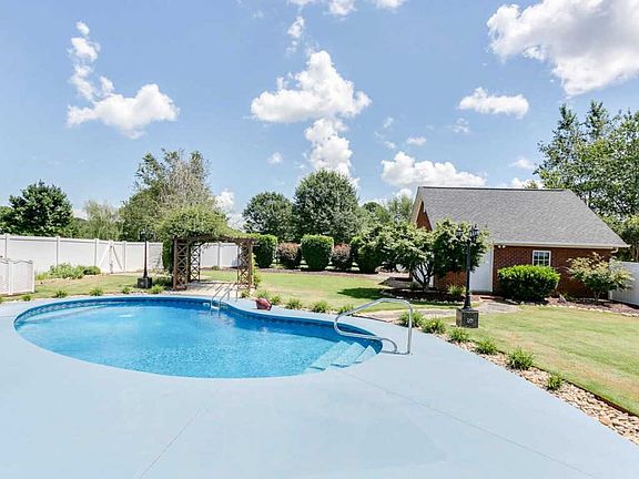 Exquisite TURTLE CREEK! Beautiful brick home with an attractive design inside and out. Curb appeal to the max with lush landscaping, SWIMMING POOL, gorgeous arched front and side porches, circular drive and DETACHED 2-CAR GARAGE/WORKSHOP make this home unique. Step inside to the OPEN FLOOR PLAN with HARDWOOD FLOORING throughout the main living/dining space, master, and guest bedroom. The spacious living room offers a gas fireplace with raised ceilings. The large, bright kitchen offers abundant cabinets, solid surface counter tops, stainless appliances, breakfast area or nice keeping room niche all open to the dining room make this an ideal space to enjoy day-to-day or when entertaining. The master suite with double trey ceiling accommodates large furniture and offers a gorgeous bath with a granite shower, separate dual vanities, custom walk-in closet, jetted tub & an additional closet. Two guest bedrooms are situated on the opposite end of the home, one with hardwood floors, sharing a Jack & Jill bath with dual vanities and separate dressing area. The study has trey ceilings and a nice view of the front yard. The PRIVATE fenced back yard is a peaceful setting backing up to pasture land. Relax on the SCREENED PORCH with brick flooring then take a refreshing dip in the SALT WATER POOL surrounded by a beautiful patio and huge TREX deck. The pergola and WORKSHOP with attic storage make the outdoor space complete. Fully sodded yard with underground irrigation front & back. Lots of storage with a walk-in attic and multiple shelved closets. NEW ARCHITECTURAL ROOF & HVAC 2017!
