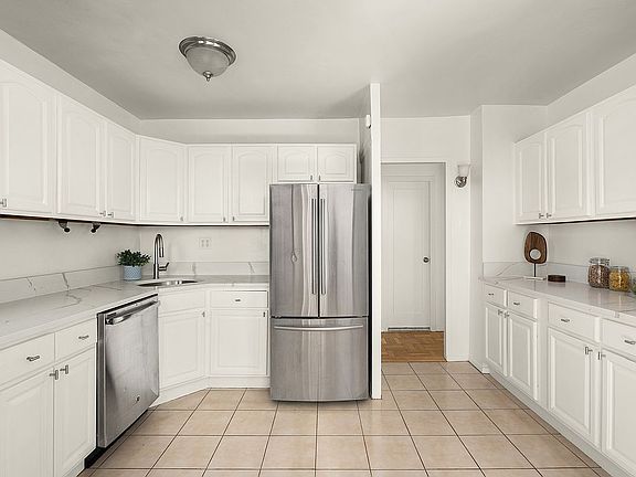 This residence features gorgeous refinished hardwood floors, oversized windows in every room, and an enormous windowed kitchen with crisp white cabinetry, sparkling stone countertops, and generous storage.