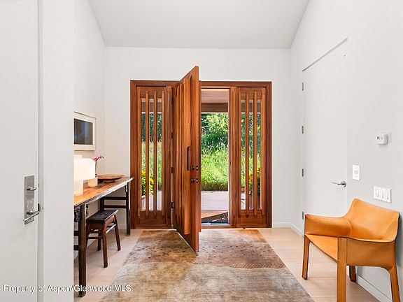 Every detail in this home echoes thoughtfulness, from the expansive mudroom to the intelligently planned laundry room with outdoor access. These spaces harmonize utility with elegance. Just off the kitchen, a tranquil water feature graces a patio, offering a serene spot to unwind to the soothing sounds framed by the stunning backdrop of the Aspen horizon.