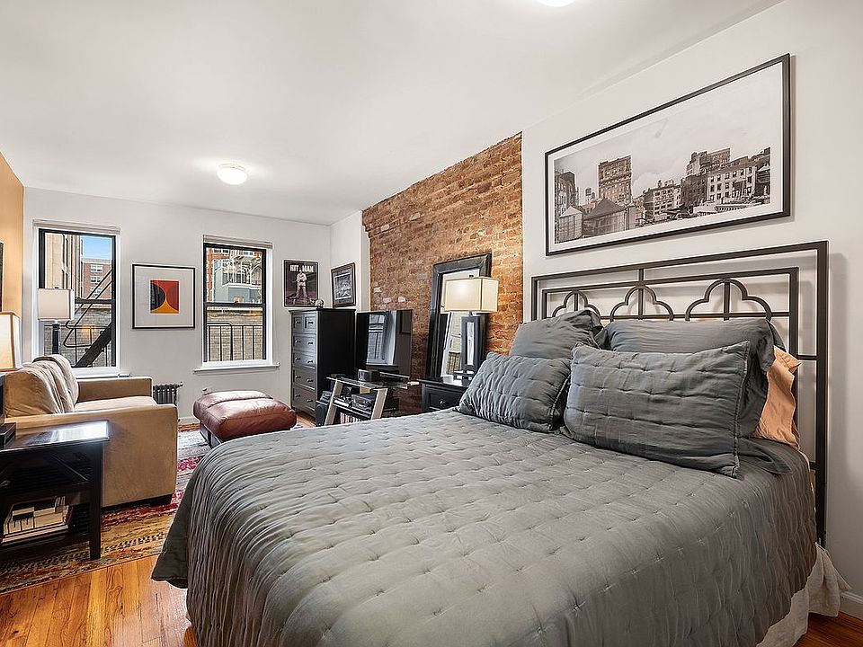 Step into perfection with this charming and sunlit straight studio apartment boasting picturesque southern views. The inviting space has a delightful touch of exposed brick and metal beams that add character. Custom-built closets and beautiful hardwood floors enhance the cozy ambiance, while the windowed kitchen and bathroom bring in extra natural light. Setting itself apart from the rest, this unit also stands out by featuring a separate entryway, recently updated kitchen & a new model through the wall air conditioner.