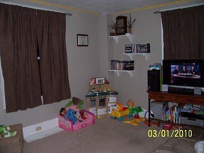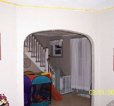 First floor entryway has linoleum flooring. Living room has wall to wall carpet. Office with linoleum flooring. Kitchen has linoleum flooring and an eat-in area. Second floor bedroom #1 has hardwood floor. Laundry room with closet. Bedroom #2 has wall to wall carpet. Bedroom #3 has wall to wall carpet, built-in closet and drawers. Full bath with linoleum flooring.