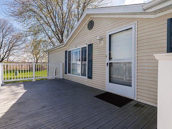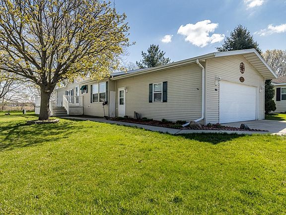 GREAT FIND LOCATED IN GREENVIEW ESTATES! LARGE MAINTENANCE FREE DECK WELCOMES YOU. EAT-IN KITCHEN WITH VALUTED CEILINGS, OAK CABINETS, SOME NEWER COUNTERS, BACKSPLASH AND FLOORING. LIVING ROOM FEATURES NEUTRAL CARPET AND VAULTED CEILINGS. 3 SPACIOUS BEDROOMS W/PRIMARY ENSUITE FEATURING UPDATED BATH WITH WALK-IN SHOWER, OAK CABINETS AND NEWER FLOORING. BIG LAUNDRY ROOM OFF GARAGE. GARAGE FEATURES SHELVING AND STORAGE. 6 PANEL DOORS AND HUNTER DOUGLAS CUSTOM SHUTTERS THROUGHOUT. PARK AMENITIES- BASKETBALL COURT, KIDS PLAYGROUND, ACCESS TO KISHWAUKEE RIVER. CURRENT LOT RENT $655 MONTHLY. SOLD AS IS.