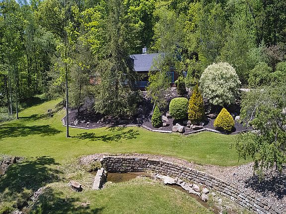 Picture perfect setting! Turn into your driveway, over a small creek and up to your chalet-style retreat, nestled on just over 2 acres! Beautiful log home construction with 4BR and 2 full/2 partial baths. Think ski lodge as you enter the family room wrapped with knotty pine walls and impressive two-story stone fireplace!! Enjoy the country style eat-in kitchen, living room, formal dining room, den, and laundry room, all on first floor. Second floor is complete with loft area (overlooking family room!) and four bedrooms including large primary bedroom complete with huge walk in closet and recently updated ensuite consisting of tile shower with niche shelf, sliding frameless doors, dual vanities, jet tub, and updated lighting. Plenty of storage with outdoor sheds (one could be a man-cave or she-shed - complete with heat and A/C) and two car attached garage! Take note of the privacy this property offers while relaxing in your hot tub or enjoying the beautifully landscaped grounds.
