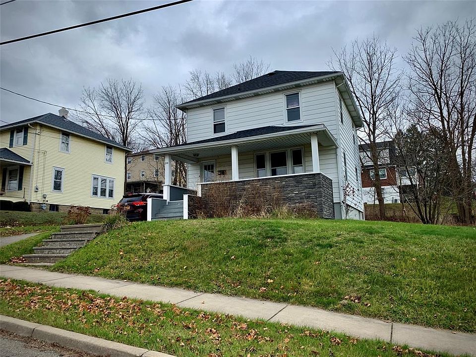 Spacious and charming craftsman with many original elements! Distant views from the generous front porch. Original unpainted woodwork on stairs, moldings, window and door frames. Hardwood throughout in excellent condition. Updated kitchen and baths, done in neutrals so you can add your finishing touches. Spacious bedrooms, oversized windows, and an attractive wood built-in cabinet upstairs. Two fulls baths. Large lot, private drive, new roof. Easy to show, call or text today!