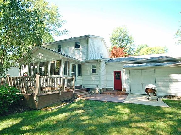 Of course there is plenty of curb appeal with this stately 3 bedroom, 2.5 bath home but, there is so much more to love here including: Brand new windows throughout; Brand new electrical service panel; New H/W tank; New sump pump; Large eat-in kitchen remodeled with granite counters, newer stove and refrigerator and beautiful laminate floors which extend into inviting foyer; Newer carpeting; Beautiful sun room with newer ceramic tile, door and heaters and surrounded by decking; Beautiful, private wooded back yard with storage shed built onto the back of the garage and concrete pad in front of entry doors; Basement waterproofed (w/transferrable warranty) and renovated (pool table stays!). New roof in 2011. Come and see this spotless and well maintained home for yourself!