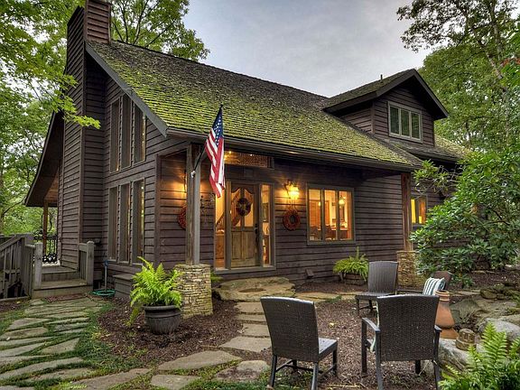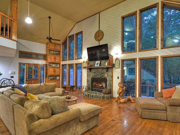 Stunning Mountain Home with Incredible Floor to ceiling glass in almost every room. Words cannot describe this masterpiece. Upon entry you will be amazed at the expansive setting of the living room surrounded by glass making you feel as if you are perched among the trees with an extra large wood burning fireplace, massive kitchen with all upscaled appliances, granite countertops, 1 guest bedroom and a dreamy Master suite with lots of glass and a wood stove fireplace, Master Bathroom, and a Closet you'll die for! Upper level Master suite with more glass and sitting area, large bathroom with double vanities, additional closet space or what once was a bedroom and open loft which looks over the great room, Downstairs you'll find a gym equipped with a wall of mirrors, Large room which could be another living room with fireplace or could be another master suite, There's a 4th bedroom here also! Screened porch with a sunken hot tub and sauna! Step into the Library for floor to ceiling glass, shelving with books and sitting area galore!! It's incredibly majestic. But it doesn't stop there walk to the lower level to find your very own Theater at home equipped with projector screen and real theater chairs. The landscaping is immaculate with 2 coy ponds, 2 waterfalls, a fire pit, sitting areas, ferns, rhododendrons, hostas, beautiful seasonal flowers everywhere, 2 outbuildings. A MUST SEE!!! Note: New roof in 10 days