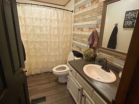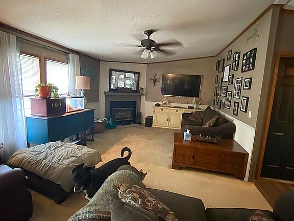 County-Large 3 bed 2 bath double wide mobile home on permanent foundation. New Metal roof and new septic (2011) Formal LR, den with FP, kitchen w/bar and breakfast/dining room. Kitchen has tile look linoleum. Appliances and LG washer and Dryer included. Cornered front porch, new double deck (2021) 33ft above ground pool and detached double garage/work shop. Partial privacy fencing in front, backyard fenced in with wire, chicken coop with fenced in area. Large trees plenty of shade in the front