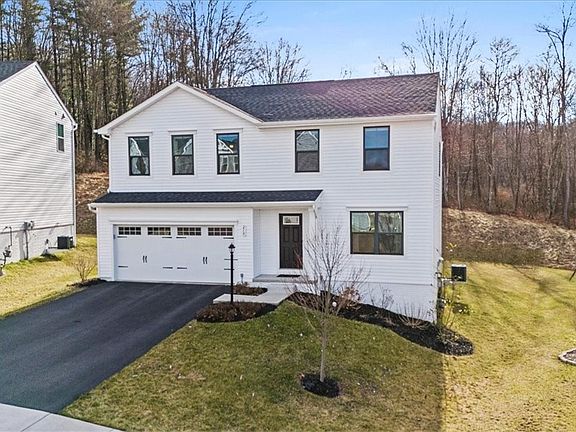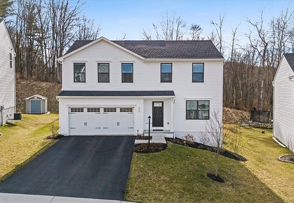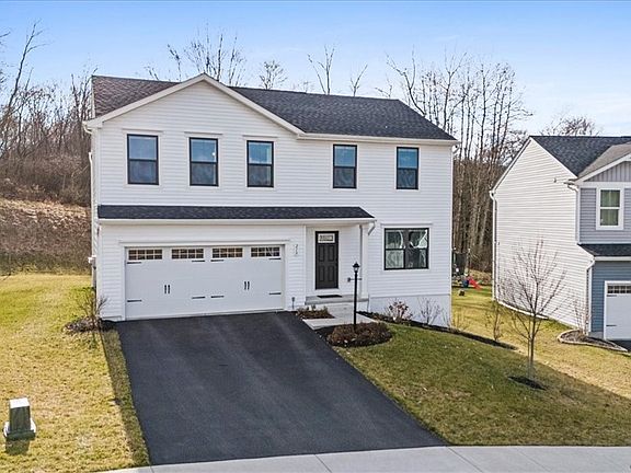 Wonderful, like new ( 2020)home with 4 BR, 2 full and 1 half bath with another bath plumbed in basement. Great curb appeal with black trim on white. Open concept , spacious home with great room that flows to an open kitchen and dining space.4 large bedrooms ( 3 with walk in closets) and laundry on upper level. Nicely appointed kitchen has a three part slider out to a stamped concrete patio. Basement is ready to make whatever you decide to shape this home to your style. 2 car attached garage too! Well positioned in the plan, the lot backs to woods and has privacy and quiet to enjoy the sunsets from.
