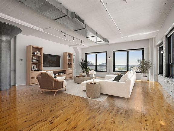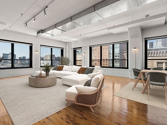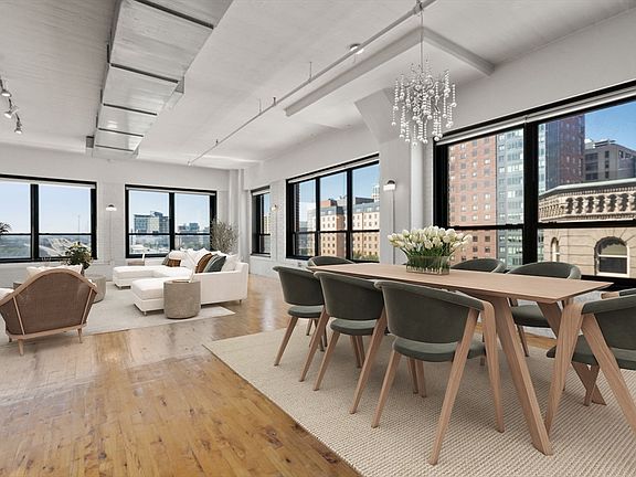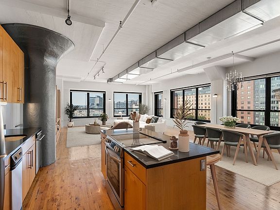 A rarely available 1,508 sq. ft. corner loft in the heart of Downtown Boston's Historic Leather District. This inviting unit showcases loft living at its finest: an expansive living space with soaring 12-foot ceilings and classic mushroom columns adding historic charm. 16 large windows flood the unit with natural light, highlighting the beautiful hardwood floors. The open-concept living and kitchen area is perfect for relaxing at home & entertaining guests.The primary bedroom suite is a true retreat, with a spacious walk-in closet & en-suite bathroom. A second unique space, bounded by sensuous chain mail curtains, has been used as guest bedroom, yoga/meditation space & exercise room. Both bathrooms are elegantly finished with marble. Enjoy the convenience of in-unit laundry and the luxury of remote-controlled electronic shades in the primary bedroom. Just steps from South Station, Greenway, Financial District & Seaport, this home offers unparalleled access to the best of Boston.