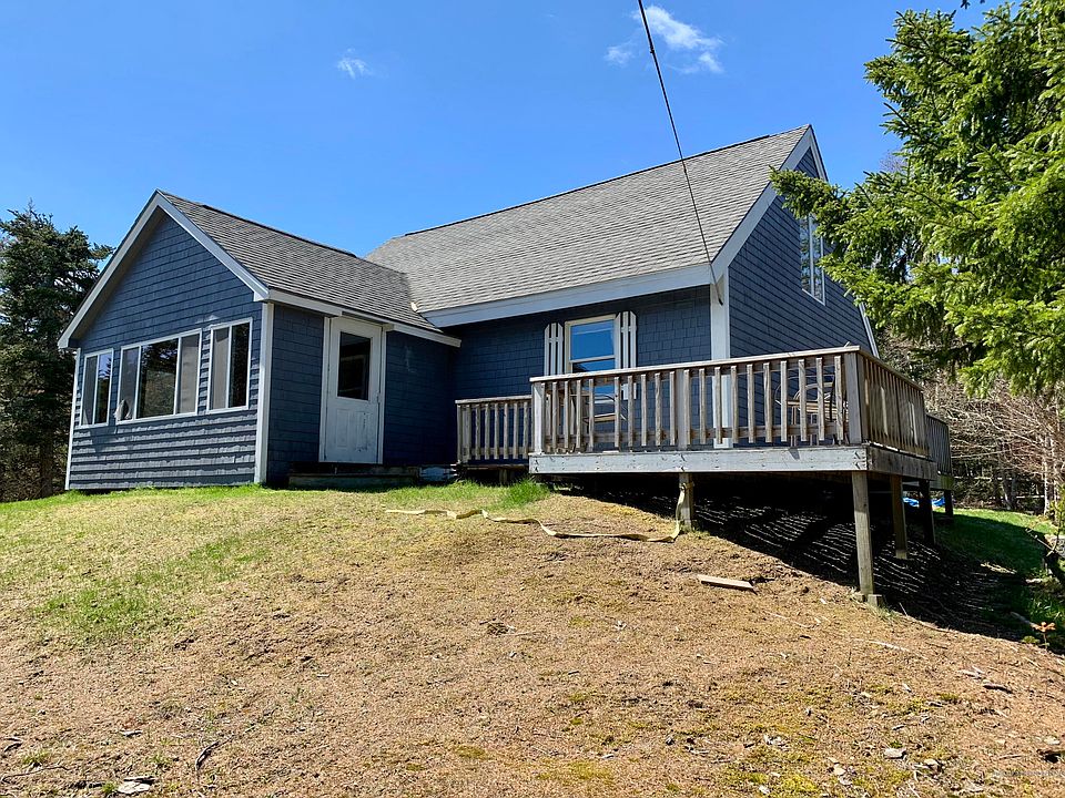 This waterfront, cape home is set back on a private 5.6 acre lot surrounded by trees with views of the Chandler River. Seller has a survey available which divides the lot into 3 waterfront lots. Home's back deck and sunroom are great locations for enjoying the river. 1st Floor has a kitchen open to the living room, a bedroom, bathroom with laundry hook up, and sunroom. 2nd floor has a loft and master bedroom and skylights. A quiet year-round retreat with easy access to Rt 1.