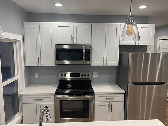 Completely renovated upper one bedroom apartment located in the village of East Syracuse. Beautiful two family located in a quiet corner lot with off street parking and a nice yard. Convenient location. The apartment includes its own private entry into a large mudroom area. Open floor plan upstairs which includes a kitchen with open dining/living area. There is a chef's kitchen with brand new stainless steel appliances, quartz counter tops that resemble marble, and new white maple cabinetry. The apartment floors are wood laminate throughout, the bedroom is carpeted. The bathroom has a marble like tile floor, a walk in 3' x 5' shower, new vanity, and toilet. There is a coat closet and a laundry closet that will accommodate a stack-able washer and dryer. We can lease the stack-able units per month if desired. Toward the back of the apartment, there is a small extra room that can be used as an office or den. A two car garage is also available in the property for lease for an additional $100.00 per month. The rent is $1250.00 per month plus utilities. We have a one year lease and require the first month rent and the security deposit (1250.00) prior to moving in. No pets. Please respond to this add for additional information and to set up a showing. Thank You. Renter responsible for natural gas, electric, cable/internet, yard maintenance, and snow removal. The landlord provides water, sewer, and trash pick up.