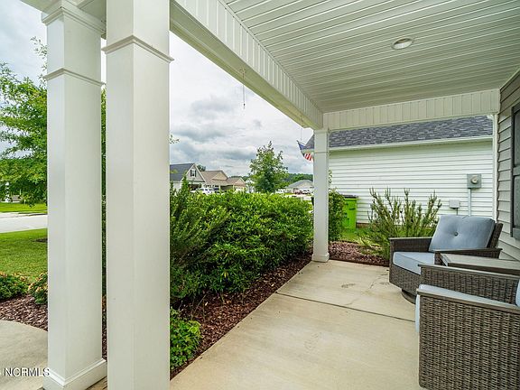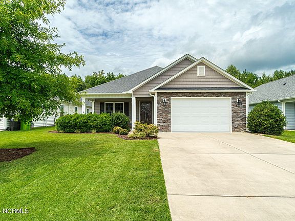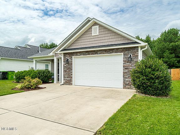 Simple, sophisticated, one level living with open floor plan and cathedral ceilings. Walk up to private front porch great for reading and relaxing. Inside the door you will notice there is LVP flooring throughout (no carpet). The living room is spacious and has a stacked stone fireplace with gas logs. The kitchen is open to the living area with quartz countertops, a gas range and a stainless refrigerator that conveys with the home. Sophisticated white subway tile in the kitchen with a center island for dining (barstools convey). There is a large walk in pantry and upgraded light fixtures in the kitchen and dining area. Large dining area overlooking the covered patio and beautifully landscaped fenced in yard. Off the kitchen is the master suite area with walk in closet and ensuite bath. Master bath has two vanities with quartz countertop. Plenty of storage with bathroom linen closet and walk in closet off the bedroom. Strategically located on the other side of the house are two additional guest rooms that feel private and provide ample space for a home office or a cozy accommodations. These two rooms share a common bath. Down the hall, there is a Laundry/mudroom and an entry to a one car garage. Great backyard with stone mulch and plenty of grass for games ands pets. Conveniently located for shopping, medical offices and hospital.