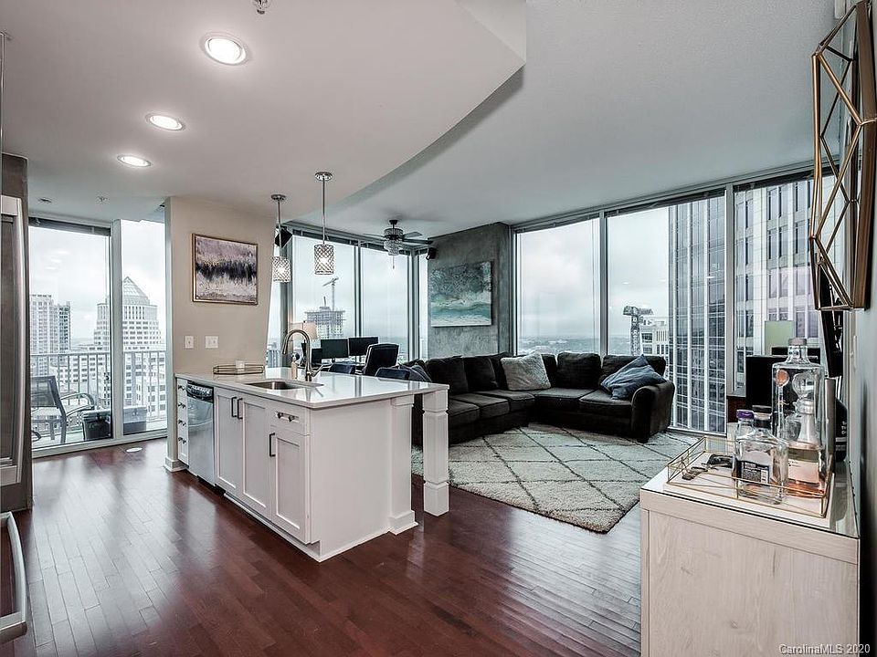 Luxurious Corner Unit Condo in The Avenue with Panoramic Skyline Views and Two Bedrooms with En Suites. Loads of upgrades including remote controlled blackout shades in both BR's (can be controlled with mobile app and/or voice with Alexa). Imagine your alarm being the shades opening at the time of your choice! Newly renovated (2020) modern Kitchen & Master bath. Cascades of natural light & stunning views create a wow factor that's hard to describe unless you see it in person. Enjoy gorgeous sunrises captured through floor to ceiling windows, fresh paint & hardwoods thruout. SS appls, Quartz counters, subway tile and island bkfast bar. Two dedicated parking spots. Bldg. amenities include 24/7 concierge, newly remodeled 24 hr. fitness center, pool, common areas & Google Fiber. Located across from the recently announced new Charlotte Public Library and new Intercontinental Hotel. Walk to everything Uptown has to offer including restaurants, nightlife, sporting events, art venues & more.