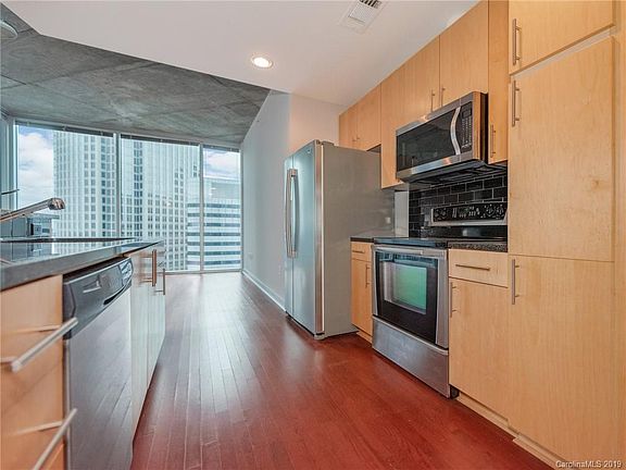 2 bedroom condo in desirable Fourth Ward with great views. Open kitchen SS appliances & breakfast bar for easy morning routines. Open dining area overlooking the Charlotte Sky Line. Spacious living room area with hardwood floors and views of the Charlotte Sky Line. Spacious master with large closet & views of the city. Master bath with dual sinks. Additional bedroom and bath are spacious, additional bathroom has enclosed shower area. Laundry closet for a large enough for a stack-able washer & dryer. Great community amenities with concierge front desk, community pool, patio relaxing area with fireplace, fitness center & more!