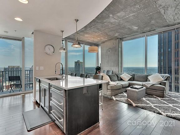 Fantastic 25th floor corner unit with floor to ceiling windows for a spectacular view. Chef's kitchen with polished quartz countertops, one-level island, stainless steel appliances, custom cabinetry with slow closing drawers, engineered hardwood flooring, dry bar and custom closet system. Smart home controlled features include wireless Lutron light switches, wireless Lutron black out shades in both bedrooms and Nest thermostat. New heating and air conditioning unit July 2018 and new water heater February 2019. New microwave December 2021. Two parking spaces deeded with unit. Amenities include pool, indoor and outdoor entertainment space, fitness center, sky lounge, business center, 24/7 concierge and so much more. Amazing Uptown location within walking distance to Bank of America Stadium, Truist Field, Spectrum Center, Romare Bearden Park,and and tons of dining and entertainment options.