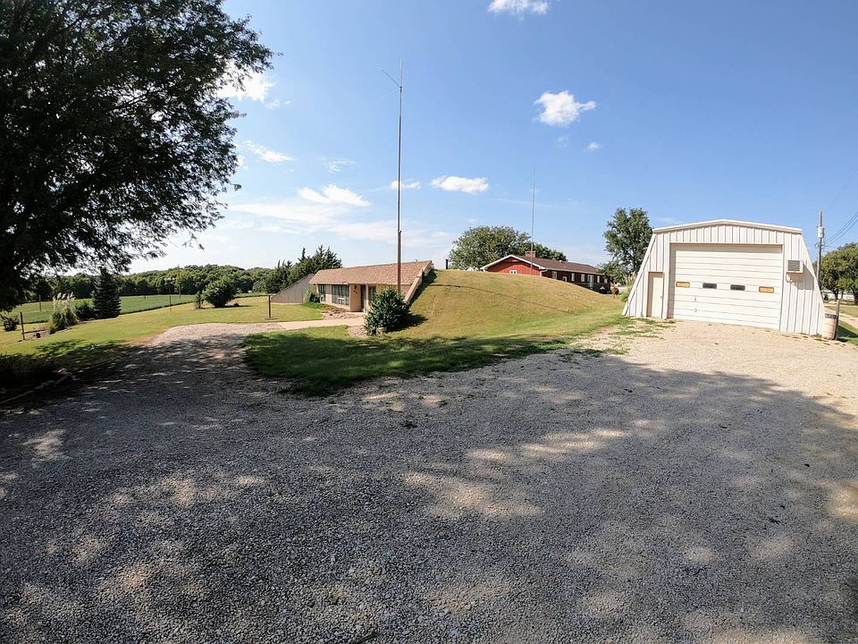 Looking for privacy, awesome views for all four seasons & 1 of a kind? This earth home has it all with its unique qualities as well as the energy efficiency it brings. Located on a secluded 5 +/- acres just inside the west city limits of Kensington, Kansas. This rare property will offer you a true taste of country living with all the city utility services. This Unique Offering Is In A Class By Itself - There's Nothing Else Like It! Call today to schedule a viewing! Property Features: The 5.5 acre property features the earth house, multiple outbuildings, and farmland. The earth home is bermed (dirt) on the North, East and West side for wind and storms. The earth insulates the house from the sides and above. The structure of the home was built with 10 to 12 inches of prestressed concrete making it resistant to fire, termites, rodents, rot, wind, hail and tornadoes. Many insurance companies offer reduced rates because of these factors. The prestressed concrete is capped off with a layer of bentonite clay and heavy thermal insulation sheeting. Then the dirt is placed on the roof and side retaining walls. The dirt layer on the roof is approximately 2.5 feet. Very energy efficient, the secret of earth homes lies in the constancy of the earth's temperature. Below the frost line (usually 24 to 60 inches below the surface), the soil maintains a fairly constant 50 degrees. The home is also protected from heat-robbing winter winds and the scorching summer sun helping it stay cool in the summer and warm in the winter so you rarely will have to use the heating and cooling system. The property does have radiant baseboard heat, wood stove and a window air unit if needed. The concrete floor helps retain passive solar heat coming in through the south-facing windows. The sod's constant temperature, transferred to the home, also means that you never have to worry about water lines freezing. Earth homes can outlast conventional homes. With few exposed surfaces, they require very little maintenance. There's no scraping and painting of siding or periodic re-roofing. You won't be cleaning gutters each spring either. Detached all-steel Chief building is 48×30, built in 1981. Concrete floor, 15×12 overhead electric garage door, insulated, heated/window air. A partitioned shop room (11×20) with overhead storage. Other property features are the 2.2 acres of farmland across the road west of the property. A one-acre tract west of the house that is currently planted to alfalfa. A 20×10 building, barn, grain bins, multiple small outbuildings, and a cedar windbreak south of the house.