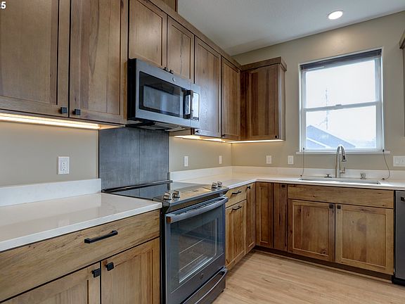 Enjoy Mt. Hood views from this beautiful newer home in charming Dufur, OR, just a short commute to I-84 for easy access. This well-appointed 3 bedroom, 2 bath home features modern finishes throughout, including gorgeous quartz countertops, stylish kitchen with under cabinet lighting, solid surface floors, an inviting open-concept living space with coffered ceiling and recessed lighting perfect for entertaining. The master suite is a treat with double quartz counter vanity, a large shower and a generous walk-in closet. Large windows throughout the home maximize natural light, the attached garage is finished nicely with hot and cold running water, stylish overhead door and easy access to the home though the laundry room.