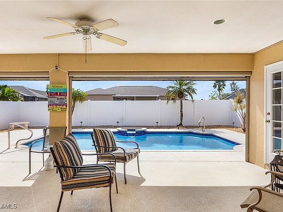 Are you looking for the perfect place to call home? Look no further! This beautiful pool home in SW Cape Coral is located right next to Sun Splash Water Park and mini Golf along with multiple restaurants and grocery stores. NOT IN A FLOOD ZONE. CITY WATER and SEWER are in and PAID OFF. When you approach your new home, you will be greeted by the beautiful curb appeal, luscious landscaping, and the charming front courtyard patio. Just imagine sipping morning coffee or unwinding in the evening with your choice for a drink.. Step inside through the double doors into the beautiful foyer and you will notice the detailed crown molding, high ceilings and the spacious living room that features the beautiful view of the pool . Enjoy days either in your living room or right outside under the oversized covered lanai. You will notice the ROLL-DOWN sun screens which were installed in 2022. Another great feature of the home is the spacious gourmet kitchen that can be the heart of the home . The SPACIOUS kitchen, complete with granite countertops, abundant cabinetry, and a breakfast bar that beckons friends and family to gather. Imagine enjoying your meals in the cozy breakfast nook that has a panoramic view of the shimmering pool. The dining room is perfect for when you have guests over for dinner. Imagine having your overnight friends or family at this lovely home. Another great feature of this home is the 18" by 18" slanted tile throughout which is perfect for your home with a pool due to our SW Florida sunny days. Enjoy the split bedroom floor plan with the guest rooms on the opposite side with their own pool bathroom with granite countertops. Every room has its own walk in closet! The owner's suite is very spacious. It features a generous bathroom with double sinks , a beautiful tiled walk-in shower, and a spacious walk in closet. The owner's suite offers a view of the beautiful pool through the sliders that allow you to enter the pool area. The current owner takes pride in his home and knows you will too! There have been numerous recent updates which will give you peace of mind. New major updates such as: A/C and duct work replaced in 2021, new pool heater 2021, pool resurfaced in 2022, pool pump 2022, water heater brand new in October 2024, privacy fence around the pool 2022, and roll-down sun screens in 2022. This home was well designed by the owner. You can see how the owner has taken care of every minor and major item in this home. Make it your home and enjoy the design and all the elements that make it a great place to call home!!!