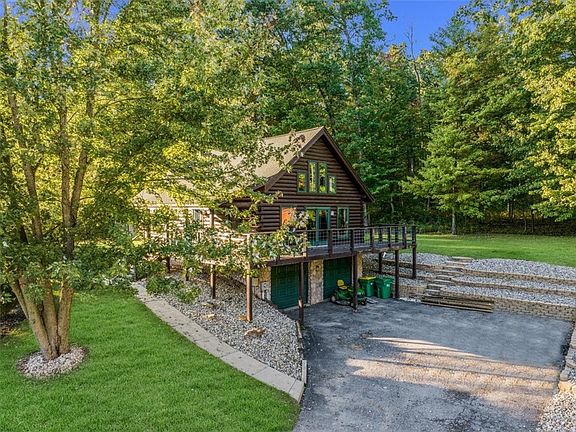 Fall in love w/ this beautiful log cabin, nestled on a private wooded lot offering the perfect blend of seclusion & convenience. Sunlight floods the open floorplan, creating an inviting atmosphere. Relax on the expansive wrap-around porch, enjoy evenings by the firepit, or explore the scenic trails right in your backyard. Inside you're greeted by a cozy fireplace in the heart of the living room, seamlessly flowing into the kitchen/dining area, perfect for gatherings. The main floor features 2 nice sized bedrooms + full bath. Upstairs you'll find a spacious 3rd bedroom, additional full bath & a versatile nook perfect for gaming/home office/personal gym, etc. The finished basement offers even more space for recreation/ relaxation, leading to an oversized 2 car garage. Beautiful golden honey-toned lumber throughout, new carpet, & updated baths make this cabin feel like a serene Colorado retreat. Ample storage on both floors ensures practicality meets comfort in this stunning home!