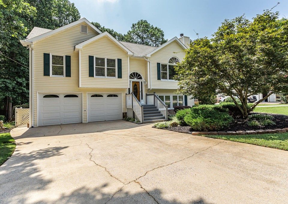 A MUST SEE! Beautiful and very well maintained house on a large level lot with 2 driveways and third car garage. No HOA! Updated kitchen with granite countertops. Living room with vaulted ceilings and gas logs. Bonus room added to the downstairs. 1-year-old HVAC. Stunning sunporch for plenty of natural light. Full bedroom with custom built-in storage and luxurious bathroom on the lower level. Underpinning ceiling on the downstairs patio. Fantastic landscaping with sprinkler system. House backs up to the woods making you feel like you are away from it all yet minutes to the interstate, shopping and dining. This house is definitely a charmer. Don't miss out!