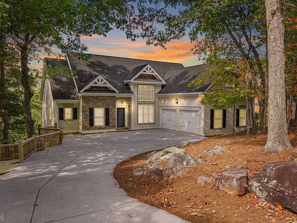 Welcome to this tucked away retreat in the outstanding Community of Lake Arrowhead. Sitting at the highest point of the community, this home is truly one of a kind with some of the most spectacular views that Lake Arrowhead has to offer. This home offers loads of curb appeal, featuring craftsman style charm, a side entry garage, stone front accents, and completely surrounded by nature. Enter Into the home via your Inviting foyer where you will be greeted the dining room and your open concept main living area. The great room features a beautiful stone fireplace, built Ins, and gorgeous windows. The kitchen offers updated appliances, stained wood cabinets, tile backsplash, breakfast bar, and eat In casual dining space. Just off the kitchen you will find a den perfect for entertaining and enjoying the views of the backyard. There are 2 bedroom suites on the main, each featuring an en suite bath. The master Is oversized with amazing views, trey ceiling, oversized shower and soaking tub, double vanities, and a huge closet. Head upstairs to find 2 bedrooms and a full bathroom. Enjoy a finished terrace level with another bedroom, office, and a large open concept floor plan to be tailored to your liking, it is also stubbed for a bath. There is also plenty of unfinished space perfect for storage. Head outside to enjoy a beautiful lot that offers tranquil views and privacy. Relax or entertain loved ones on the double deck featuring a walkway from the front driveway. Backyard is lined with trees for added privacy and has space for an outdoor fire pit or additional patio below . Property is a true retreat! This home is nestled in the foothills of the North Georgia Mountains within a spectacular community. Lake Arrowhead is a private, gated community with a 540 acre private lake, championship golf course, marina, clubhouse with restaurant, miles of hiking trails, 2 pools, tennis courts, pickle ball & much more! Other Features Include: Main HVAC is only 5 years old and second HVAC was just replaced in 2022. Basement is stubbed for bathroom. Deck has been rebuilt and features vista view pruning. Spray insulation. The storage areas in the basement are heated and cooled, have electric, and is stubbed for a bathroom.