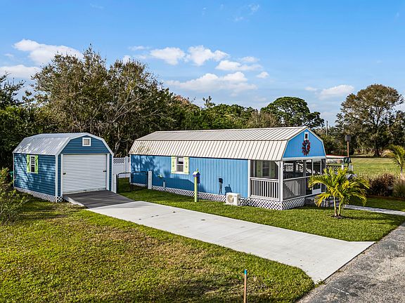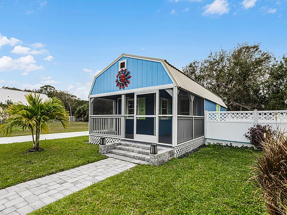 Welcome to your brand-new cottage in Cocoa, Florida! This charming tiny home offers one bedroom and one bathroom, a full-sized kitchen, and a spacious living area. You'll love the oversized loft that can easily fit a king-sized mattress, which is about 14x12 feet, making the living space or storage areas even larger! The metal roof and screened front porch add to the durability and charm of this home. Enjoy cooking up your catch of the day in the covered barbecue pit and smoker. The fenced backyard is perfect for furry friends, and the air-conditioned, large shed can fit a boat, truck, or car. The community offers a dog park, floating dock with a pond, and a community garden. This is the perfect spot for anyone who loves to fish, garden, or just relax in a peaceful setting. Don't miss this unique opportunity to own a piece of Florida paradise. Schedule your showing today and experience the charm of this cozy and comfortable tiny home!