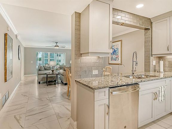 AVAILABLE FOR SEASON 2025 - 3 MONTHS MINIMUM. WELCOME TO YOUR NEW VACATION RENTAL IN BELLA COSTA II ON VENICE ISLAND, LOCATED ON THE VENICE INTRACOASTAL WATERWAY! Nestled in the heart of a serene waterfront community, this exquisite TURNKEY FURNISHED 2 bed/2 bath unit has been completely renovated throughout, with the finest details from the porcelain tile flooring to the crown molding and plantation shutters. As you enter through the front door, you are met with a spacious open living area welcoming you. The balcony has been extended from the living area which is glass enclosed/screened where you can enjoy your morning coffee while taking in the picturesque water views. The beautiful kitchen boasts top-of-the-line stainless steel appliances, quartz countertops, modern cabinetry and fixtures. The primary bedroom with king size bed has a walk-in closet which also houses your washer and dryer, en-suite bathroom with beautiful tile and walk-in shower. The guest room has a queen bed and also has an en-suite bathroom with walk-in shower. For added convenience, this unit offers easy access to the elevator just outside your door, there is a reserved carport, and you are just steps from the community pool! This fabulous condo community provides direct water access for boating and fishing. Paradise right at your doorstep. Bella Costa includes a heated community pool, clubhouse and fitness center. Enjoy numerous outdoor seating areas including a waterfront fire pit! Located on Venice Island in walking distance to the wide variety of boutiques and restaurants on W Venice Ave. Just a short drive to the beautiful Venice Beach and other numerous beaches, golf courses and more!