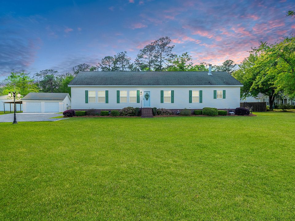 You do not want to miss this! The opportunity is here to own a turn key home on almost 2 acres with two huge detached garages and a storage shed close proximity to everything you could possibly need. From the moment you pull in you will fall in love with the beautiful landscaping, mature trees and tree lined driveway. The home is one level and boasts three bedrooms, 2 full bathrooms, a formal living room open to dining room, large kitchen, a den/second living room and walk in laundry room. When you enter the home you will immediately notice the new, beautiful hardwood flooring and nine foot ceilings. The first room you will enter in is the living room which is open to the spacious dining area. On the left side of the home you will find the two secondary bedrooms and full bathroom.On the opposite side, giving you privacy you will find the owners suite which is huge and has a walk in closet with custom built ins. The owners suite also has its very own bathroom which was recently updated with ceramic tile, dual marble vanities and a new walk in shower. Going back out you will find the kitchen is very spacious with newly updated porcelain tile floors, an island, beautiful white cabinets, all updated stainless steel appliances and a spacious pantry. From the kitchen you will find the den/second living area with hardwood flooring and a lovely wood burning fireplace. That leads you to the walk in laundry room or to your back double French doors which lead you to the spacious back porch perfect for rocking and enjoying the peace and serenity this property has to offer. Your back porch will lead you to a lovely concrete walkway taking you to your first detached garage. It has two automatic doors and would make a perfect man cave or workshop. From there you will find the second detached garage with a huge roll up door perfect for a large boat, camper or RV. This garage is HUGE and is perfect for storing all your toys! There is also a spacious storage shed with a lean to on the property as well. Behind the home you will find woods making it very peaceful and private. In addition to all of this there is also a SECOND septic tank to the left of the property where there use to be a second home AND the home has public water PLUS a well. This property offers endless opportunities and of course has NO HOA giving you the freedom to do what you please. It just keeps getting better because this home not only gives you the freedom of that country living feeling it is also only 2 miles from Cane Bay shopping center which includes Publix, restaurants, shopping and more. It is only 2 miles from the new Roper Hospital and 7 miles from all the great things Summerville, South Carolina has to offer. It is centrally located to Moncks Corner, Goose Creek and Summerville plus just 25 miles or so to Downtown Charleston. What more could you possibly want? Call today to schedule your private showing before this gem is gone.