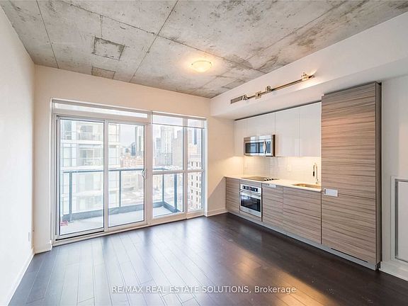 Enjoy breathtaking city views from this bright, modern 1-bed, 1-bath suite at 210 Simcoe, available December 1 in the heart of downtown Toronto. The open-concept layout features contemporary finishes, exposed concrete ceilings, laminate flooring throughout, and abundant eastern light that brightens the living space. Rent includes storage locker, central air conditioning, heat, and water for added comfort. Residents enjoy premium amenities, including a concierge, fitness centre, guest suites, party/meeting room, and a rooftop deck with garden space. Situated steps from St. Patrick and Osgoode subway stations, this unbeatable location places you within walking distance of UofT, OCAD, major hospitals, City Hall, Eaton Centre, and countless shops and restaurants.