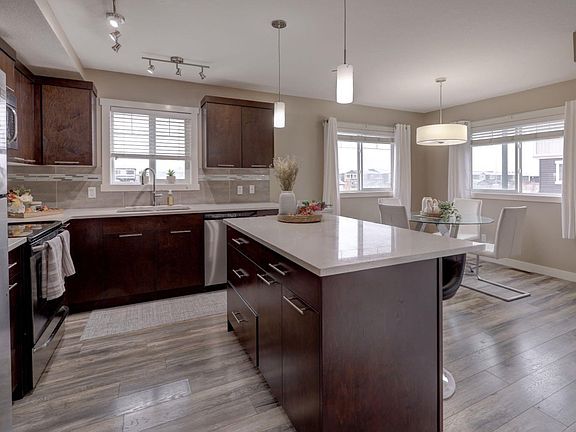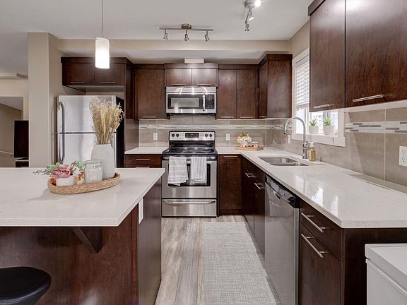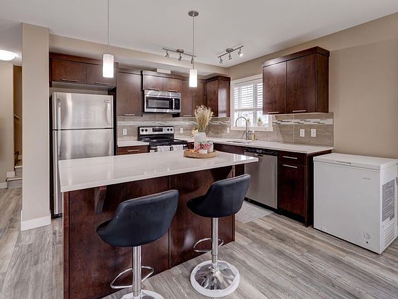 HOME SWEET HOME! Welcome to your stunning Townhouse in the family-friendly community of Skyview Ranch! Step inside this beautifully updated END UNIT 4 BEDROOM TOWNHOUSE offering over 1,604 SQFT of comfortable, modern living space. The main floor features a versatile bedroom, perfect for guests, a home office, or a gym. Head upstairs to the bright and airy open concept living area, where large windows fill the space with natural light. The gourmet chef's kitchen is well designed with plenty of counter and cupboard space, quartz countertops, a quartz island with a breakfast bar and stainless steel appliances , opening to a spacious dining area that flows seamlessly onto your private balcony, the perfect spot to enjoy your morning coffee. This level also includes a convenient 2-piece powder room and convenient in-suite laundry. On the top floor, you’ll find a spacious primary bedroom complete with a 4-piece ensuite and walk-in closet, plus two additional bedrooms and another 4-piece bathroom, providing plenty of room for the whole family. RECENT UPDATES include new vinyl plank flooring throughout and fresh paint, giving the entire home a fresh, modern feel. Additional highlights include an attached single car garage with a driveway for extra parking, and visitor parking conveniently located right beside the unit. Situated in a quiet part of the complex, you’ll also enjoy extra green space which is IDEAL FOR PET OWNERS and added privacy with your side entrance. This well maintained home is close to schools, parks, shopping, restaurants, and major roadways, making it ideal for families or investors alike. Book your private tour of this GEM today!